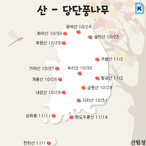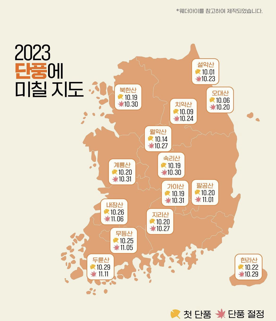 우리나라에서 첫 단풍소식을 알리는 곳으로 설악산의 단풍 절정은 10월 23일 부근이 될 예정입니다.