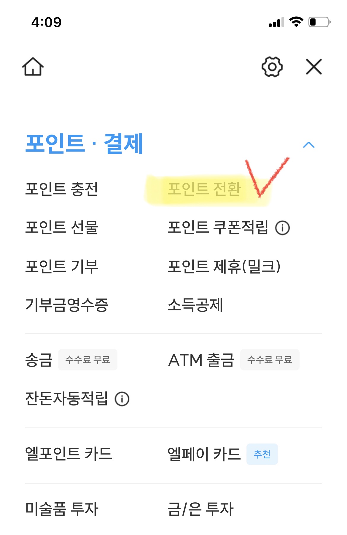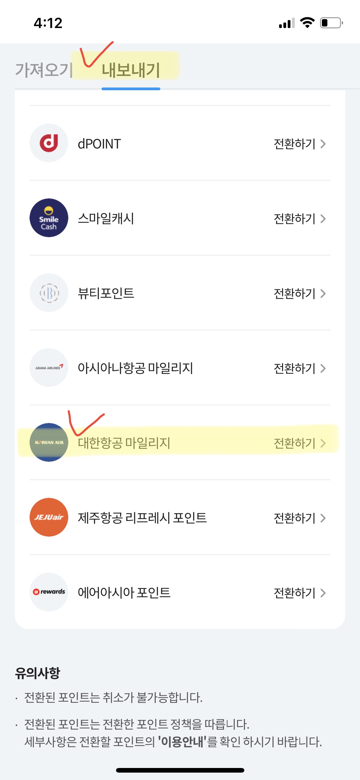 ✅ 엘포인트어플접속 - 목록아이콘 - 스크롤 쭉 내리면 포인트전환 - 내보내기 - 대한항공 마일리지