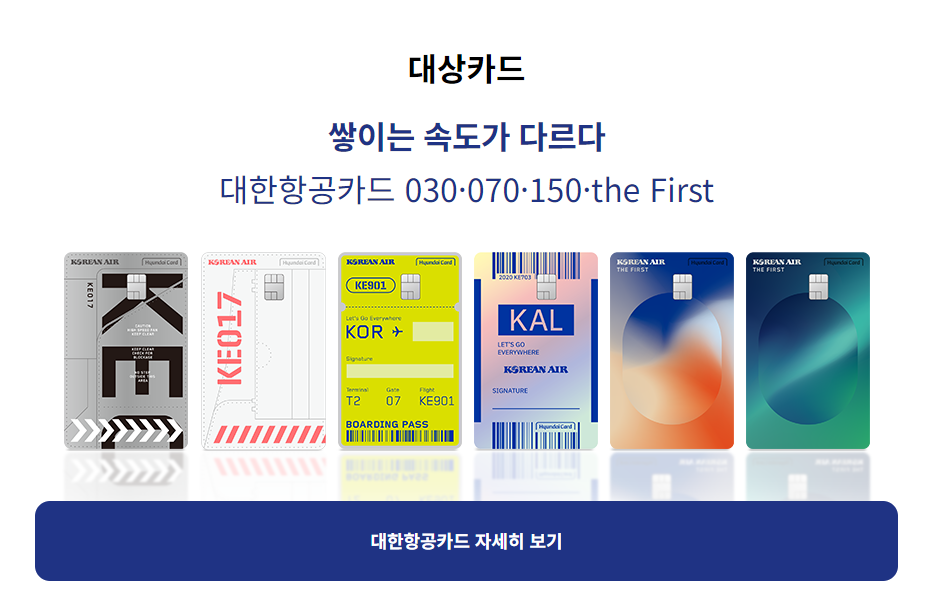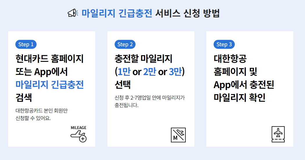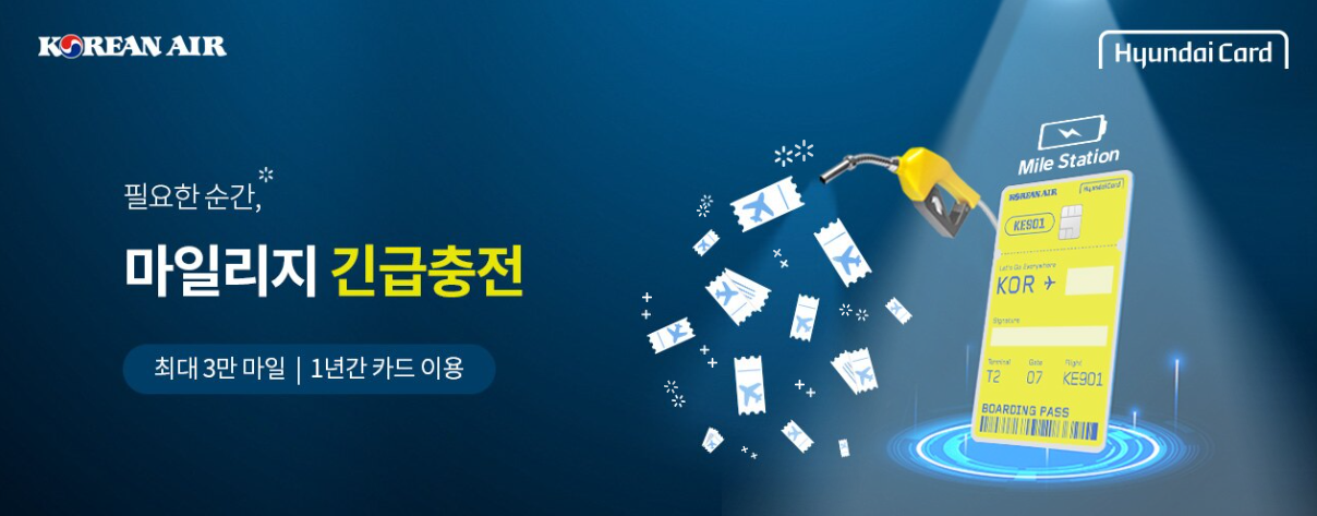 ✅ 대한항공 현대카드를 발급 받으면, 대한항공 마일리지 긴급 충전 서비스를 이용할 수 있음