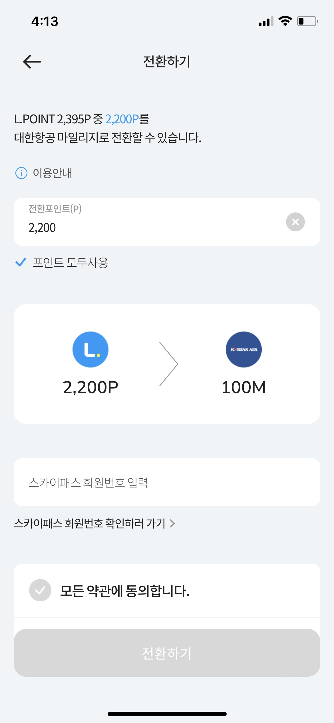 ✅ 스카이패스 회원번호 입력한 후 전환