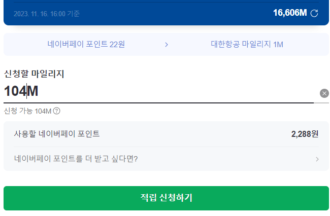 ✅ 네이버페이- 목록- 대한항공 마일리지 적립- 원하는 만큼의 마일리지 전환