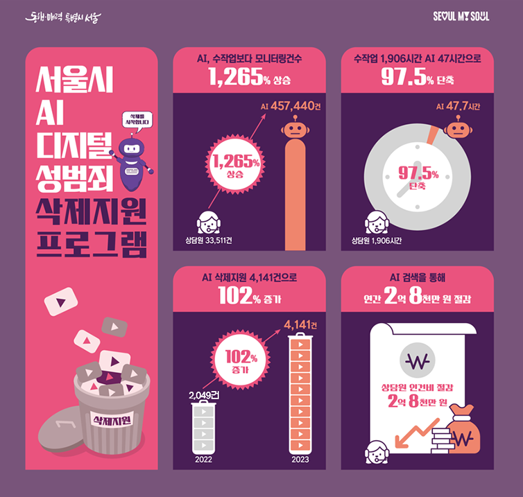 서울시는 디지털성범죄 예방과 피해자 지원을 위해 2022년 3월 ‘서울 디지털성범죄 안심지원센터’를 개관했으며, 올해 3월에는 개관 1년을 맞아 서울연구원과 함께 전국 최초로 AI 삭제지원 기술을 개발‧도입한 바 있다. 3개월 간의 테스트 기간을 거쳐, 현재 SNS 상의 피해영상물을 24시간 실시간 자동으로 추적‧감시해 찾아내는 역할을 하고 있다.