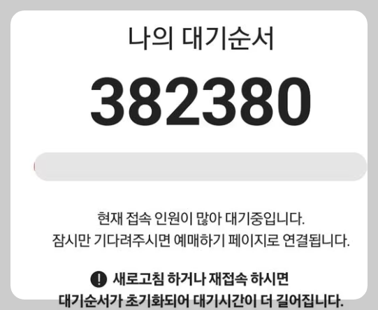 | * TIPS 새로고침 절대 금지❌❌ 주변에 보니 티켓팅할 때 새로고침을 너무 자주하는 분들이 계시던데, 59초-60초 넘어가는 시점에서 3번 미만으로 하시는걸 추천드립니다. 그 이유는 새로고침을 너무 자주할 경우 부정클릭으로 인식해 예매 창 진입이 아예 불가할 수 있습니다. 대기순번에서 새로고침 절대 금지❌❌ 대기 순번을 받았을 때 새로고침을 누르면 다시 접속하게 되므로 신규로 들어가게 됩니다. 때문에 절대절대 새로고침하시면 안됩니다. |