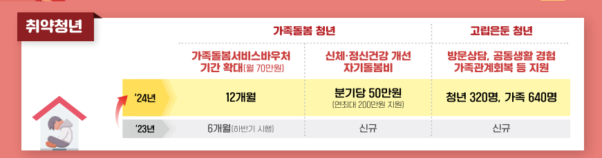 | 가족돌봄청년 | : 장애, 신체 및 정신의 질병 등으로 돌봄이 필요한 가족을 돌보고 있는 14~34세의 청년 : 가족돌봄서비스 바우처 기간을 6개월에서 12개월로 확대하고 : 월 70만원까지 지원한다 : (신규개설) 신체,정신건강 개선 자기돌봄비 ▶분기당 50만원( 연최대 200만원까지) 지원 |