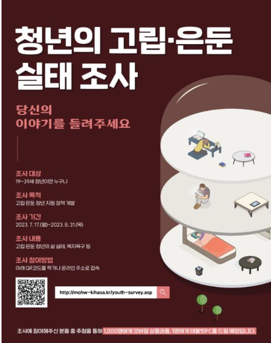 | 고립은둔청년 | : 전담기관&인력을 통해 고립은둔청년 대상자를 발굴/유형화 하고, 사회복귀&재적응을 위한 개인별 맞춤형 사례관리도 통합지원할 계획 : 2023년 7월, 전국적으로 고립/은둔청년 실태조사가 진행됨 |