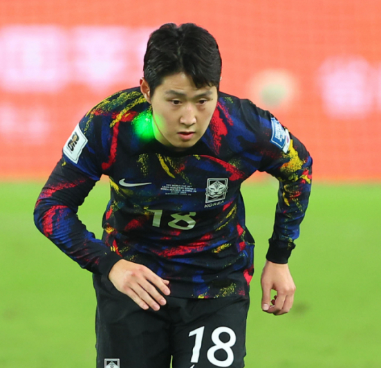 중국 선전 유니버시아드 스포츠센터에서 열린 2026년 북중미 월드컵 아시아 2차 예선 한국과 중국 경기에서 프리킥을 시도하는 이강인의 몸에 중국 과중이 쏜 레이저 포인터가 표시되어 있습니다.