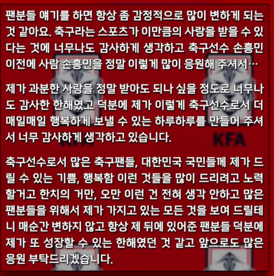 '팬분들 얘기를 하면 항상 좀 감정적으로 많이 변하게 되는 것 같아요. 축구라는 스포츠가 이만큼의 사랑을 받을 수 있다는 것에 너무나도 감사하게 생각하고 축구선수 손흥민 이전에 사람 손흥민을 정말 이렇게 많이 응원해 주셔서..